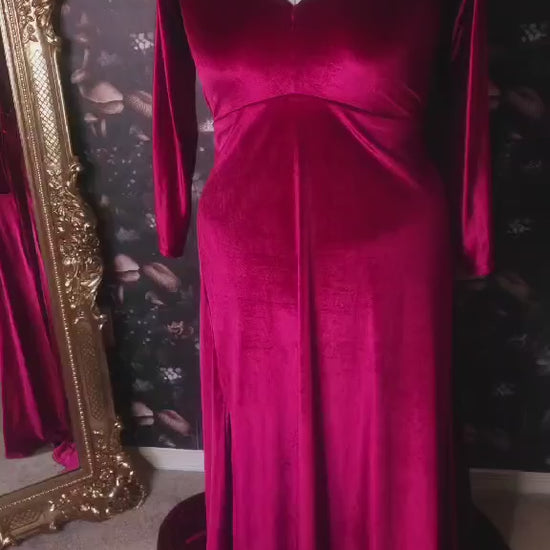 This is a Fitted top red velvet dress. Was a custom, but they went another route. Waistline is a 36"-40" average waistline adjustable. Long train & front works for someone 5'7 or shorter.